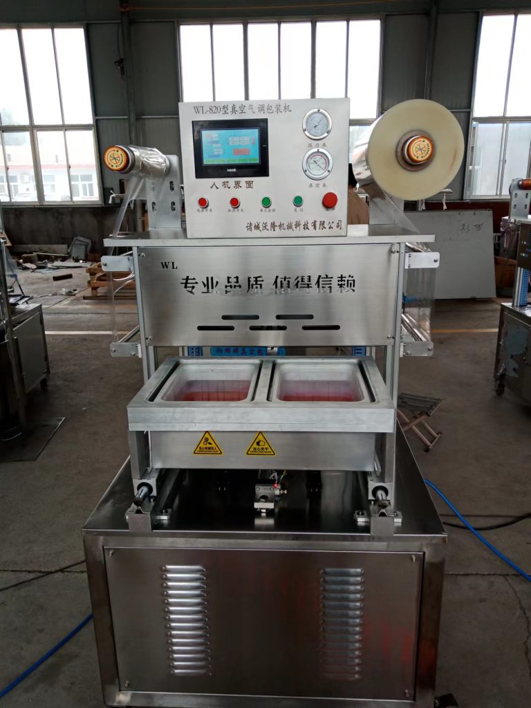WL-840/820盒式氣調鎖鮮包裝機 產品概述: 該設備是專為食品級PP、PET材質的盒、碗、杯、多格餐盒及鋁箔盒等包裝而設計的一款新型氣調鎖鮮封盒機。操作簡單,故障率低。盒裝產品,攜帶方便,檔次高,也深受越來越多消費者的喜愛。該設備已申請國家實用新型專利。 配置: 程控系統(tǒng):日本三菱(松下)、國產信捷等名牌控制元器件2.氣控系統(tǒng):臺灣名牌亞德客氣動元器件3.外箱體材質:304不銹鋼。 產品外觀: 樣品 產品特點 真空氣調包裝機是一種新型食品保鮮技術,利用各種保護性氣體所起的不同作用,抑制引起食品變質的大多數微生物生長繁殖,并使活性食物( 果蔬等植物性食品 ) 呼吸速度降低,從而使食品保鮮并延長保鮮期。應用領域 : 真空氣調包裝機廣泛適用于:生鮮肉、熟肉制品、魚類、家禽、貝類、水果、咖啡、茶葉、蔬菜、面包等超市配送食品。真空氣調包裝具有使食品保質、保鮮、保色、保形、保味的特點,風靡歐美市場。真空保鮮包裝機主要針對盒裝肉類,熟食等產品進行 、紫外線殺菌、抽真空、充氣 然后封口操作。高度自動化是其最大技術特點,真空保鮮包裝機主要通過對盒內食品的抽真空,和充保鮮氣體操作來確保產品得以更好的保存,和延長保鮮時間。本機可配置充氮氣 氧氣 二氧化碳充氣裝置,可延長保鮮時間。適合熟食,生鮮等食品的鎖鮮包裝. ?
